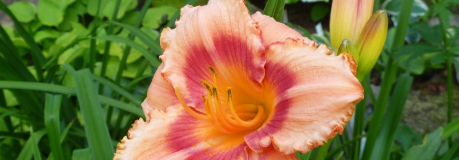 Strawberry Candy is peachy-pink with a rose eye-zone and a gold throat. The ruffled pie crust edge is also rose in color. It is 26 inches tall and the blossoms are 4 ½ inches. The blooms start early, mid-season and then it just keeps going. It is a semi-evergreen tetraploid and here is the parentage (Panache × Tet. Siloam Virginia Henson). This has been the second most popular daylily to Stella de Oro for a long time. Its reliability and foliage that does not fade, even in drought, helped it become the Winner of numerous awards including the Stout Medal, daylily’s highest award.