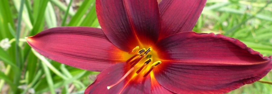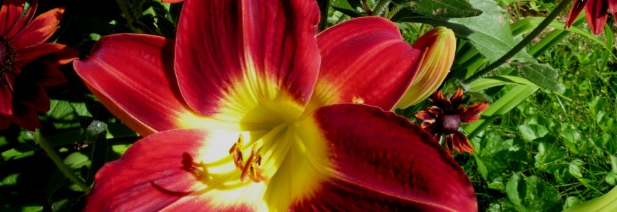 stunning velvety, Christmas red flower that is 6 ½ inches, with a very large lemon yellow throat and eye zone. The flowers are triangle shaped and the bright yellow shows up on the lower petals as well. The plant is 28” and a semi-evergreen diploid that blooms mid to late season.