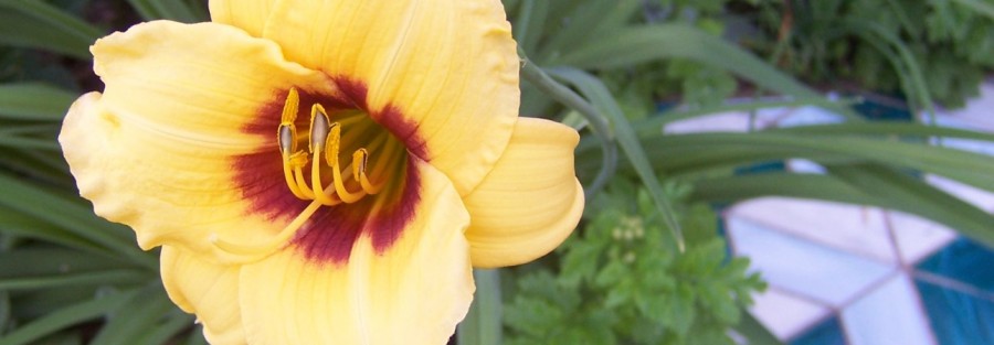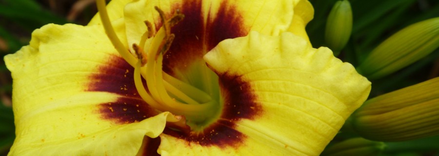 Doodlebug is a really cute miniature daylily that is only 18 inches tall but is covered with 2.25 inch lemon yellow flowers with a dark purple eye-zone and a green throat. It is an early, mid-season, Dormant, Diploid. I love the contrast when placing her in front of a large spider of a different color.