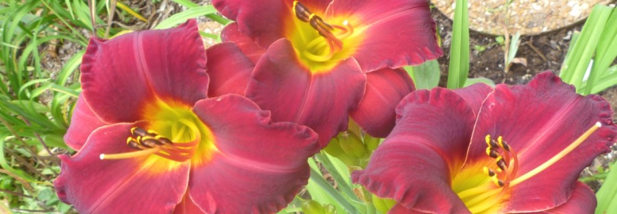 This rich red beauty has a bright yellow throat changing to green deep inside, and the stamens are also bright yellow. It has a nice ruffled edge, a velvety texture that shows purple hews in some light and very heavy substance. The 5″ slightly fragrant blooms start mid-season. A semi-evergreen tetraploid that adds a wow factor.