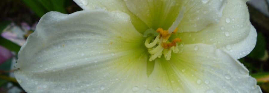 The near white petals are held wide open in a triangular shape. It is whiter in full sun and more lemon yellow in part shade.